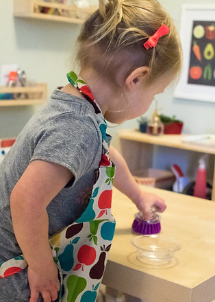 Our prepared classroom is intentionally designed to be a joyful, peaceful, and purposeful place. Children experience joy through free choice and the mastery of personal skills at their own pace. They are peaceful as Grace and Courtesy is taught in the classroom which creates a peaceful, respectful, and harmonious environment. Lastly, they are purposeful for the children engage in meaningful, satisfying hands-on “work” real-world tasks that they choose and complete to master coordination, independence, and focus.